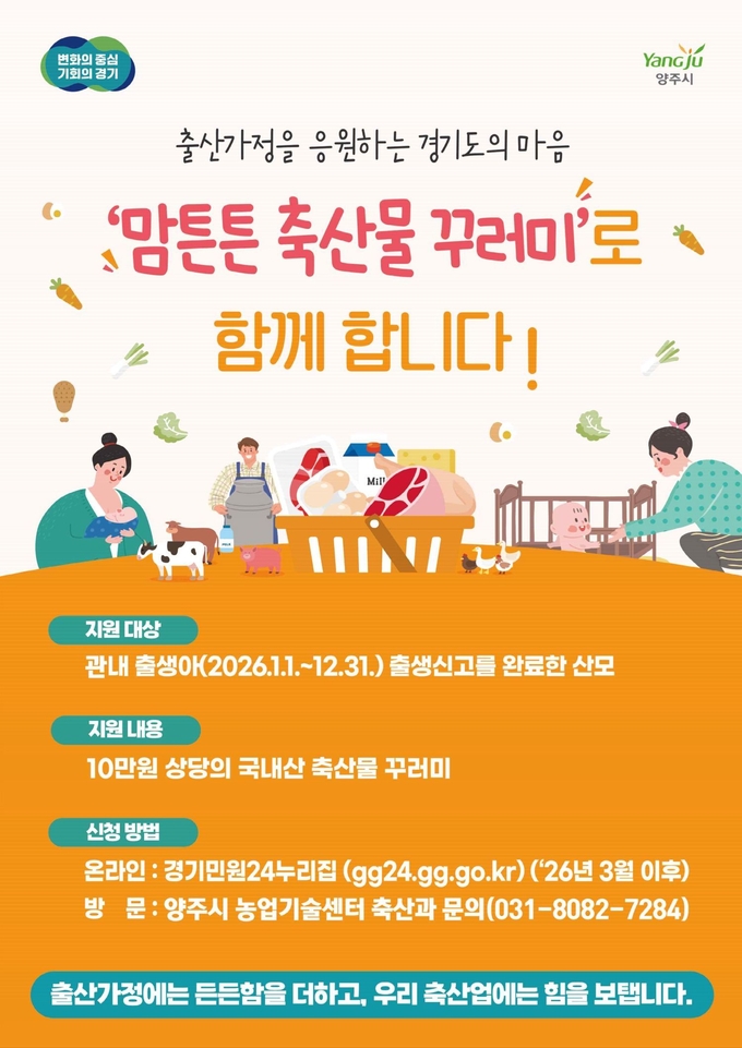 양주시는 출산 가정의 건강 증진과 지역 축산물 소비 촉진을 위해 ‘2026년 맘튼튼 축산물 꾸러미 지원사업'을 추진한다.