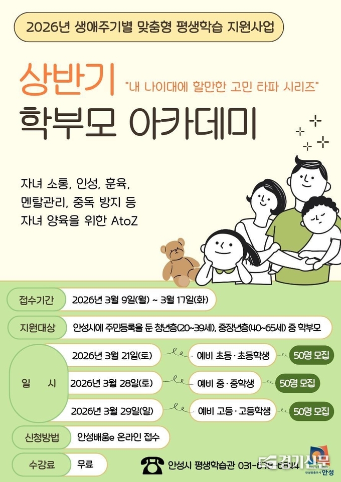 안성시는 급변하는 양육 환경에 대응하고 건강한 부모-자녀 관계 형성을 돕기 위해 ‘2026년 상반기 학부모 아카데미’를 운영한다고 밝혔다.