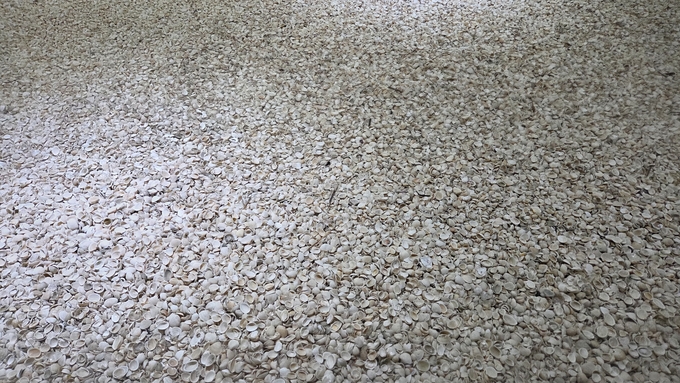 자연스럽게 쌓인 꼬막 껍질과 목탄 가루의 흔적은 특정 이미지를 재현하기보다 물질이 시간 속에서 형성한 결과를 그대로 드러낸다.