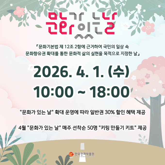 한국만화박물관은 오는 4월 1일부터 시민들의 문화 향유 기회를 넓히기 위해 ‘문화가 있는 날’ 혜택을 전격 도입한다고 지난 20일 밝혔다.