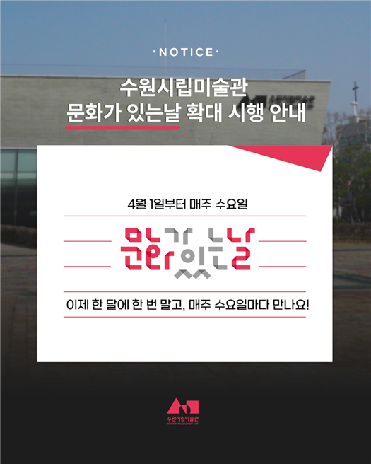 경기도 수원시립미술관(관장 남기민)은 4월 1일부터 ‘문화가 있는 날’ 운영을 기존 매월 마지막 주 수요일 1회에서 매주 수요일로 확대 운영한다고 25일 밝혔다.