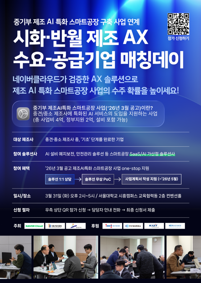 제조 AX 매칭데이는 디지털 전환(DX)에 관심 있는 시화,반월 산업단지 제조기업을 대상으로 진행되며, 시흥시기업인협회, 안산시, 안산상공회의소 등과 협력하여 참가 기업 모집을 지원한다. 네이버클라우드를 포함한 주요 솔루션 기업들이 참여하여 ▲제조기업과 솔루션 기업 간 1:1 맞춤형 매칭 상담 ▲제조 AI 특화 사업 솔루션 비교 및 정보 제공 ▲정부지원사업 참여를 위한 사업계획서 작성 지원등 다양한 프로그램이 운영될 예정이다.