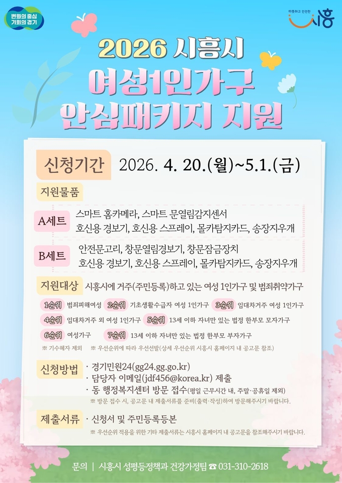 시흥시는 관내 여성 1인 가구 등의 안전한 일상 보호를 위해 ‘2026년 시흥시 여성 1인 가구 안심패키지 지원사업’을 추진하고, 오는 20일부터 5월 1일까지 신청을 받는다.