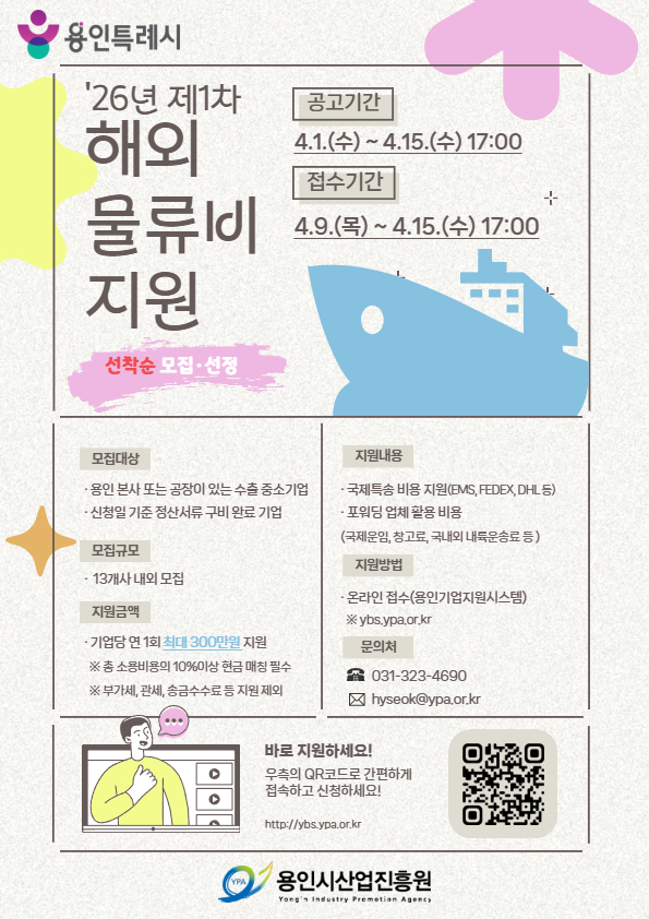 용인특례시와 용인시산업진흥원은 최근 중동 사태로 인한 글로벌 공급망 불안이 심화됨에 따라, 관내 수출기업의 피해를 최소화하기 위한 ‘수출 물류비 지원사업’을 긴급 추진한다고 1일 밝혔다.