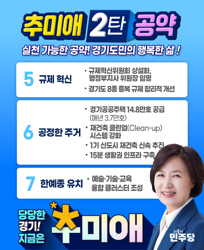 더불어민주당 추미애 경기도지사 경선후보가 1일 규제 혁신, 주거 안정, 예술·기술‧교육 클러스터 조성을 포함하는 공약 2탄을 발표했다.