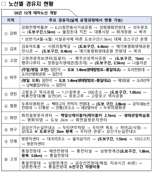 특히 올해는 관계 부처 간 긴밀한 협력을 통해 ‘테마노선’ 일부 코스의 회당 참가인원과 운영일을 확대했다. '평화의 길' 사업을 위해 문체부는 운영 총괄 및 홍보를 통일부와 국방부는 비무장지대의 평화적 이용과 안전을 행안부는 접경지역 발전계획 운영 및 지원을 담당하기로 했다. 기후부도 생태조사 협력을 맡고 경인 5곳을 포함한 전체 10곳의 지방정부는 노선 관리 및 현장 운영을 하기로 했다. 문체부 산하 한국관광공사는 온라인 운영 및 홍보마케팅을 담당한다.