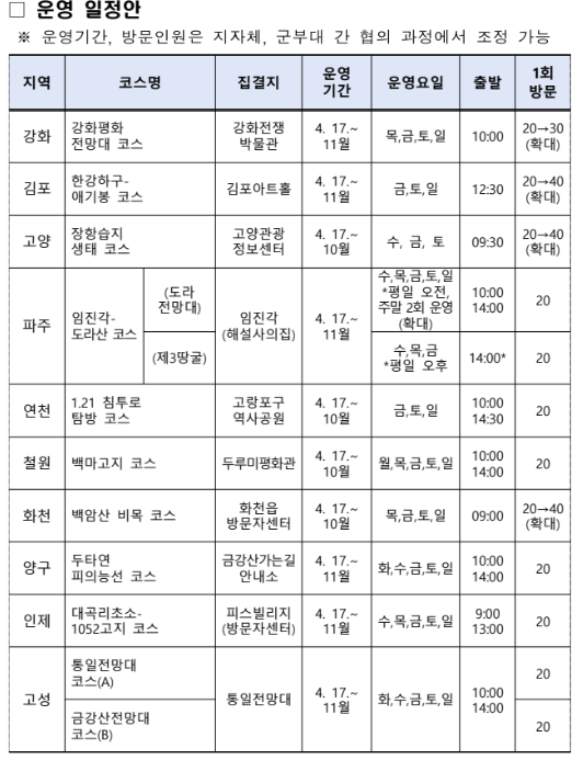 안보지역 특성상 외국인은 제한되고 대한민국 국민만 체험할 수 있다. 본인 인증 및 신분 확인 절차를 진행하고 참가비는 1인당 1만 원이다. 참가를 희망하는 국민은 1일부터 ‘디엠지(DMZ) 평화의 길’ 공식 누리집(www.dmzwalk.com)과 걷기여행 모바일 앱 ‘두루누비’를 통해 온라인으로 사전에 신청할 수 있다.