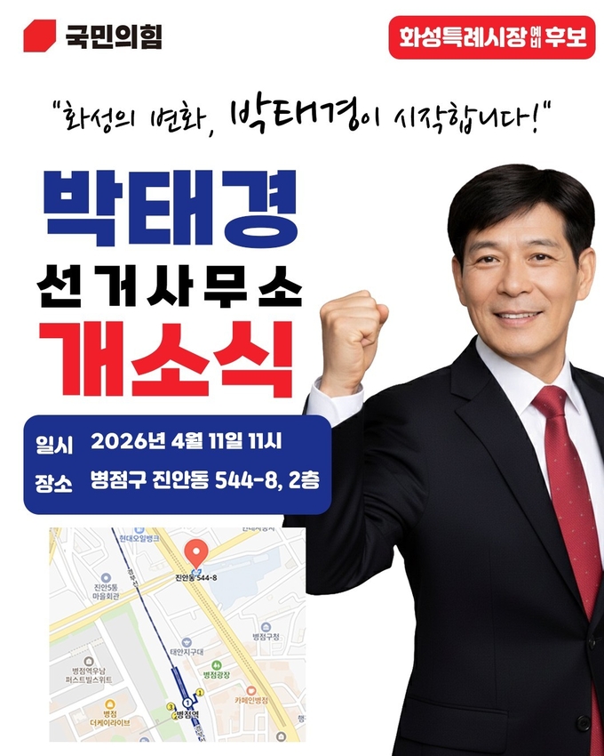 박태경 화성특례시장 예비후보가 오는 11일 병점구 진안동 544-8번지에 열고 본격적인 선거 행보에 돌입한다.