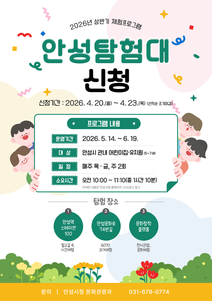 참여를 희망하는 어린이집과 유치원은 4월 20일부터 23일까지 안성시청 홈페이지 ‘고시/공고’ 게시판을 참고해 이메일로 신청할 수 있으며, 접수는 선착순으로 마감된다.