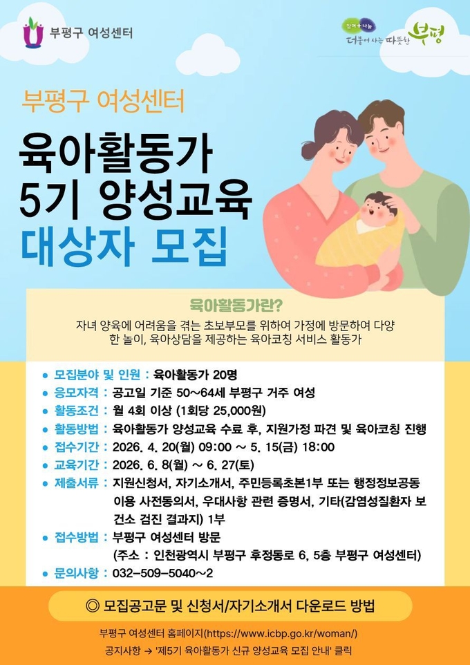 인천 부평구가 오는 20일부터 5월 15일까지 육아활동가 20명을 모집한다.