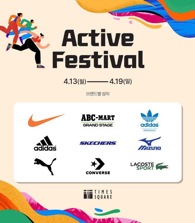 타임스퀘어 관계자는 “야외 활동이 늘어나는 시즌을 맞아 스포츠웨어를 일상 패션으로 활용하는 트렌드가 확산되고 있다”며 “이번 ‘액티브 페스티벌’을 통해 합리적인 가격으로 봄 나들이 룩을 완성하시길 바란다”고 말했다.