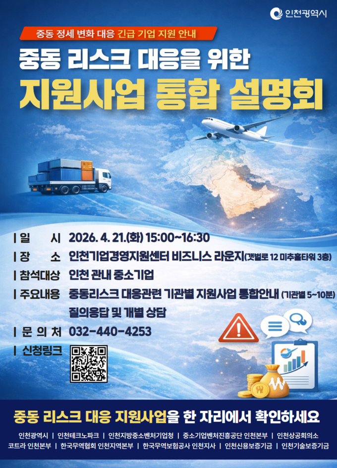 인천시는 오는 21일 중동 지역 지정학적 리스크 확대에 대응해 ‘중동 리스크 대응 지원사업 통합 설명회’를 개최한다.