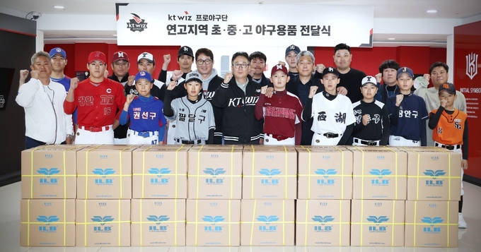 kt wiz가 사회 공헌을 위해 ‘수원 유소년 야구단’에 야구용품을 기부했다.