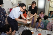 인천시의회 이용범 의장은 22일 계산1동에 있는 경로당을 찾아 노인 150여 명에게 중복맞이 삼계탕을 대접하는 행사에 참여했다. 이날 이용범 의장은 주민자치위원회와 방위협의회 회원들과 함께 삼계탕과 수박 등 정성스레 준비된 음식을 노인들에게 친절히 대접했다. /박창우기자 pcw@