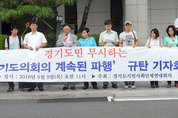 파행을 거듭하고 있는 경기도의회를 보다못한 시민단체들이 한나라당의 무조건적인 의사일정 참여를 촉구하고 나섰다. 경기시민사회단체연대회는 9일 도의회앞에서 기자회견을 갖고 “정쟁만을 일삼고 도민은 안중에도 없는 도의회에게 분노를 금할 수 없다”며 “도의회 의장과 부의장, 양당 대표 등 책임자들은 도민에게 사과하고 한나라당은 의사일정에 참여하라”고 촉구했다. 시민단체연대는 “8대 도의회를 지금껏 모니터 해왔으나 원구성 초기부터 시작된 파행이 매 회기마다 진행됐다”며 “한나라당은 원구성 문제와 4대 특위구성, 의원발언 문제 등 사사건건 의사일정 발목잡기만 하고 있다는 인상을 지울 수 없다”고 주장했다. 이어 “급기야 명분도 실익도 없는 무리수를 던지며 본회의장을 점거하더니 이번엔 의장사퇴를 요구하고 의사일정을 거부하는 코메디를 보여주고 있다”며 “더 심각한 문제는 이같은 행태가 계속해서 반복될 것이 충분히 예상된다는 사실”이라고 우려를 표했다. 시민단체연대는 “도민과 민생우선의 경기도의회가 되기 위해서는 한나라당이 어떠한 전제조