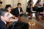 민주당 원혜영 원내대표는 15일 오전 국회교섭단체 대표 연설을 통해 전면적 국정 쇄신을 촉구했다. 원 대표는 이날 “이명박 정부는 미래로 가지 않고 과거로 퇴행하고 있다. 민심을 존중하지 않고 거스르고 있다”며 “‘헌 부대’와 ‘헌 술’을 모두 갈아야 하고, 신뢰 상실과 민생 파탄을 초래한 책임이 가장 큰 경제팀을 중심으로 현 내각을 전면 개편해야 한다”고 주장했다. 원 대표는 “잘못된 고환율 정책을 강행한 경제팀을 전면교체하는 것이 국민과 시장이 기다리는 시그널이고 그래야 신뢰를 회복할 수 있다”고 거듭 강조했다. 그는 일본 중등교과서 해설서의 독도 영유권 명기와 관련, “일본의 도발은 동북아시아의 평화에 찬물을 끼얹는 일로서 결코 용납할 수 없는 역사적 범죄행위”라면서 “일본의 오만방자한 영토주권 침해행위를 국민과 함께 강력히 규탄한다”고 말했다. 그는 “더욱 충격적인 것은 지난 9일 한일정상 회동에서 후쿠다 야스오 총리가 이명박 대통령에게 명기입장을 전달했다는 교도통신과 NHK의 연이은 보도”라며 “이 대통령은 9일 홋카이도에서 무슨 일이 있었는지 밝혀달라”고 요구했다. 이어 그는 금강산 관광객 총격 피살 사건과 관련, “북한 당국에 강한 유감을 표시한