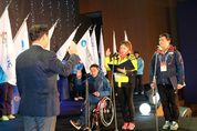 ‘다함께 굳세게 끝까지’ 장애인 스포츠인들의 겨울 축제인 제13회 전국장애인동계체육대회가 16일 강원도 평창군 알펜시아리조트 그랜드볼룸에서 열린 개회식을 시작으로 나흘간의 열전에 들어갔다. 2018 평창동계올림픽 홍보영상 상영으로 시작된 사전행사에 이어 시각장애인 오케스트라인 한빛예술단 등이 축하공연을 펼치며 분위기를 띄운 이날 개회식에는 김종 문화체육관광부 차관과 김성일 대한장애인체육회장, 최문순 강원도지사 등 내빈과 각 시·도 선수단 등 500여명이 참석했다. 김성일 대한장애인체육회장은 대회사에서 “장애인동계체전이 2018평창장애인동계올림픽을 앞두고 동계스포츠 활성화에 기여할 것”이라며 “최선을 다해 훈련에 임한 선수들에게 뜨거운 박수를 보낸다”고 말했다. 이어 김종 차관은 축사에서 “여러분은 평창패럴림픽에서 세계를 깜짝 놀라게 하고 국민들에게 열정과 감동을 선사할 주인공이 되기에 부족함이 없다. 그동안 갈고닦은 기량으로 이번 대회에서 값진 결실을 맺고, 나아가 그 기량이 2년 후 평창까지 이어지기 바란다”고 밝혔고, 최문순 지사는 환영사를 통해 &ldquo