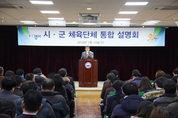경기도는 13일 수원시체육회관 2층 대회의실에서 ‘시·군 체육단체 통합 설명회’를 개최했다. 이날 설명회에는 이창수 도 체육과장과 최규진 도체육회 사무처장, 강병국 도체육회 본부장을 비롯해 시·군청 체육과장과 체육단체 관계자 100여명이 참석했다. 도는 설명회에서 (구)경기도체육회와 (구)경기도생활체육회가 통합을 추진한 사항을 바탕으로 시·군 체육단체가 통합을 추진할 가이드라인을 설명한 뒤 통합과 관련한 쟁점사항에 대한 토론을 진행했다. 경기도는 대한체육회와 국민생활체육회가 오는 3월 27일 이전 통합을 완료하겠다고 발표함에 따라 시·군 체육단체 통합을 중앙회 통합 이전에 완료할 계획이다. /정민수기자 jms@