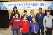 경기도체육회는 9일 경기도체육회관 중회의실에서 ‘2015 글로벌 인재육성 선정대상자 지원증서 전달식’을 가졌다. 이날 전달식에는 최규진 도체육회 사무처장과 글로벌 인재육성 선수로 선정된 정주미(포천 일동고·바이애슬론·여), 이준형(단국대·빙상 피겨스케이팅), 김민석(안양 평촌고·빙상 스피드스케이팅), 정현(경기일반·테니스), 박지수(성남 분당경영고·농구·여), 여서정(경기체중·체조·여), 엄도현(용인 기흥중·체조·여) 등 7명을 비롯해 지도자, 도체육회 관계자 등이 참석했다. 정주미와 이준형, 김민석은 지난 2월 열린 제96회 전국동계체육대회에서 금메달을 획득하며 각각 한국 여자 바이애슬론과 남자 피겨, 남자 스피드스케이팅 중장거리 기대주로 떠올랐다. 또 정현은 올해 열린 국제테니스챌린저대회에서 수차례 우승하는 등 한국 남자 테니스의 희망으로 떠올랐고 전국체전 농구 여고부 우승의 주역인 박지수는 최연소 여자농구 국가대표로 선발됐으며 여서정과 엄도현은 올해 전국소년체전에서 다관왕에 등극, 한국 체조의 차