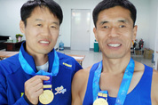 “지난 해 4관왕을 달성했는데 올해도 첫 경기에서 좋은 결과가 나와 다관왕을 바라보게 돼 기쁩니다. 남은 종목에서도 최선을 다해 지난해 못지 않은 성적을 거두겠습니다.” 28일 강원도 강릉종합경기장에서 열린 육상트랙 남자 800m 시각장애(T11)에서 2분43초34의 기록으로 금메달을 목에 건 신현성(평택시·55)의 소감. 30대 초반 망막색소변성증으로 시각을 잃으며 시각장애 1급 판정을 받은 신현성은 11년 전 경기도장애인체육대회 육상종목에 평택시 대표로 출전했다가 입상한 것이 인연이 돼 그 때부터 도 대표선수로 활동하기 시작했다. 지난해 전국장애인체전 육상트랙에서 800m와 1천500m, 5천m, 10㎞단축마라톤에서 우승하며 4관왕에 등극하는 등 11년 동안 전국장애인체육대회에 출전하면서 매년 경기도에 메달을 안긴 신현성은 이번 대회에서도 윤병서 감독(49)과 호흡을 맞춰 800m 우승을 차지했다. 평택에 마땅한 중거리 훈련 코스가 없어 서울 남산 산책로를 오가거나 도내에서 열리는 각종 마라톤대회 출전을 통해 훈련을 했다는 신현성은 “윤 감독이 세종시에 살고 있어 함께 호흡을 맞추는 시간이 많지 않아 훈련에 어