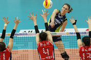 올 시즌 프로배구 V리그 여자부에서 치열한 선두 경쟁을 벌이고 있는 수원 현대건설이 대전 KGC인삼공사를 제물로 연패 탈출에 성공하며 또다시 선두로 올라섰다. 현대건설은 22일 수원실내체육관에서 열린 NH농협 2014~2015 프로배구 V리그 여자부 홈 경기에서 혼자 29점을 올린 우즈베키스탄 용병 폴리나 라히모바(등록명 폴리)와 양효진(15점)을 앞세워 KGC인삼공사를 세트 스코어 3-0(25-13 25-22 25-10)으로 완파했다. 6연승 이후 최근 2연패로 주춤했던 현대건설은 이로써 10승 4패가 돼 여자부 팀 중 처음으로 두자릿수 승수를 올리며 승점 27점을 올려 성남 한국도로공사(9승 6패·승점 26점)와 화성 IBK기업은행(9승 5패·승점 25점)을 제치고 엿새 만에 1위 자리를 탈환했다. 반면 지난달 2일 현대건설에게 승리를 거둔 이후 승수를 올리지 못한 KGC인삼공사는 9연패 수렁에 빠지며 2승10패, 승점 8점으로 여전히 최하위에 머물렀다. 1세트 초반 상대 리시브가 불안한 와중에도 더블 컨택트 등 각종 범실을 저지르며 KGC인삼공사에 끌려가던 현대건설은 4-5에서 황연주의 블로킹과 오픈 득점을 묶어 역전에 성공하며