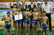광주초가 제13회 증평인삼배 전국장사씨름대회에서 우승배를 품에 안았다. 광주초는 6일 충북 증평군 증평종합스포츠타운에서 열린 대회 사흘째 초등부 단체전에서 부산 해운대연합을 4-3으로 힘겹게 따돌리고 정상에 올랐다. 광주초는 첫 경기에서 이하빈이 해운대연합 김동준에게 들배지기로 내리 두 판을 따내며 기선을 잡았지만 강동환이 상대 차민수에게 0-2로 패해 승부를 원점으로 돌렸다. 세번째 경기에서 서제원이 김동훈에게 밀어치기로 두 판을 따내 종합 전적 2-1을 만든 광주초는 네번째 경기에서 홍희재가 상대 김민재에게 먼저 옆무릎치기를 허용한 뒤 들배지기로 내리 두 판을 이기며 종합 전적 3-1로 달아나며 우승에 한발 더 다가섰다. 그러나 5번째 경기와 6번째 경기에서 안영찬과 최재훈이 상대 김기성과 노민기에게 연거푸 패하며 종합 전적 3-3으로 다시 원점을 만든 광주초는 마지막 7번째 경기에서 김민수가 첫 판을 판정승으로 이긴 뒤 둘째 판을 잡채기로 내줬지만 마지막 판을 밀어치기로 이기며 극적인 우승을 차지했다. 초등부 개인전 용장급(55㎏이하)에서는 홍희재(광주초)가 김기성(부산 운송초)을 2-0으로 꺾고 정상에 올라 단체전 우승에 이어 2관왕에 올랐고 청장급(