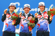 한국 여자 양궁이 2010 광저우 아시안게임 단체전에서 2차 연장까지 가는 접전 끝에 우승을 차지하며 아시안게임 4회 연속 정상에 올랐다. 윤옥희(예천군청), 주현정(현대모비스), 기보배(광주광역시청)로 구성된 한국은 21일 중국 광저우 아오티 아처리 레인지에서 열린 대회 여자 단체전에서 중국과 4엔드까지 220-220 동점을 이룬 뒤 1차 연장에서도 승부를 가리지 못했지만 2차 연장에서 30점 만점을 기록하며 우승을 차지했다. 이로써 한국 여자 양궁은 1998년 방콕 아시안게임 우승 이후 4회 연속 우승을 차지하며 세계 최강임을 다시한번 입증했다. 한국은 전날 열린 골프에서 김민휘(안양 신성고)와 김현수(예문여고)를 앞세워 남녀 개인전과 단체전을 모두 휩쓸며 전관왕을 차지하는 등 이번 주말 금 17개, 은 14개, 동메달 20개를 추가하는 황금 위크엔드를 만들며 일본(금 30·은 53·동 58)의 추격을 뿌리치고 종합 2위 굳히기에 나섰다.