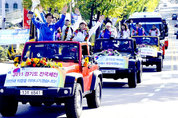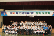 제91회 전국체육대회에서 사상 첫 종합우승 9연패를 달성한 경기도선수단의 환영식 및 해단식이 지난 15일 경기도청 운동장에서 열렸다. 이날 해단식에는 도체육회장인 김문수 도지사와 김광회 도의회 문화관광위원장, 전찬환 도교육청 부교육감, 이상원 경기신문 부사장을 비롯한 도단위 기관장, 가맹경기단체 전무이사, 선수단 등이 500여명이 참석했다. 해단식에 앞서 선수단은 이날 오후 2시30분 수원월드컵경기장에 집결해 오픈카와 버스를 이용, 창룡문과 팔달문, 도청 사거리를 거쳐 도청까지 카퍼레이드를 벌였다. 해단식에서 홍광표 총감독(도체육회 사무처장)은 김문수 지사에세 우승기와 우승배를 봉납했고 육상·유도·인라인롤러·궁도·럭비·배구·볼링·수영·씨름·정구 등 종목 우승을 차지한 10개 종목 전무이사들이 종목 우승배를 김문수 지사에게 봉납했다. 또 도육상경기연맹 김선필 사무국장과 레슬링·복싱·세팍타크로·스쿼시·역도·조정·체조·카누·테니스·하키 등 준우승을 차지한 10개 종목 전무이사들이 일반부 우승배와 종목별 준우승배를 김광회 위원장에게, 안선엽 도교육청 평생체육건강과장과 근대5종·농구·야구·핀수영·사격 등 종목 3위를 차지한 5개 종목 전무이사들이 고등부 우승배와 3위