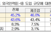 국내 300인 미만 중소기업의 절반가량이 내년 고용허가제(E‑9) 외국인 근로자 도입 규모를 올해(13만 명)보다 확대해야 한다고 생각하는 것으로 나타났다. 한국경영자총협회(경총)가 최근 제조·건설·서비스업체 312곳을 대상으로 조사한 결과, 응답 기업의 45.2%가 확대 필요성을 답했으며, 올해 수준 유지 의견은 43.6%, 축소 필요 의견은 8.3%였다. 업종별로는 제조업과 건설업에서 확대 응답이 각각 46.0%, 48.0%로 높았고, 서비스업에서는 유지 의견이 52.8%로 가장 많았다. 외국인 근로자를 고용하는 이유로는 ‘내국인 구인의 어려움’이 61.5%로 가장 많았고, 이어 상대적으로 낮은 인건비(21.5%), 낮은 이직률(7.7%), 2년 초과 고용 가능(2.9%) 순이었다. ‘내국인 구인의 어려움’은 2023년 92.7%에서 2024년 34.5%로 낮아졌다가 올해 61.5%로 다시 증가했다. 경총은 “외국인 근로자 활용은 단순한 비용 절감이 아닌 실제 일손 부족 때문이라는 현실을 보여준다”고 분석했다. 기업들은 외국인 근로자 고용 과정에서 다양한 어려움도 겪고 있다. 실무적 문제로는 의사소통(50.3%), 직접 인건비 부담(32.7%), 간접 인