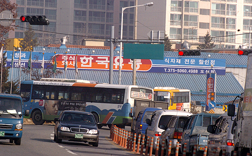 1번국도변 오산 갈곶삼거리에서 한 시내버스가 신호를 무시한채 버젓이 적신호에서 불법 좌회전을 하고 있다.