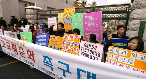 경기지역 고교평준화 추진위원회 소속 회원 30여명은 7일 경기도교육청 앞에서 집회를 갖고 "명문고 진학 경쟁에 우리 아이들이 웃음을 잃었다"며 안산.광명.의정부 지역의 고교 평준화 실시를 촉구했다.