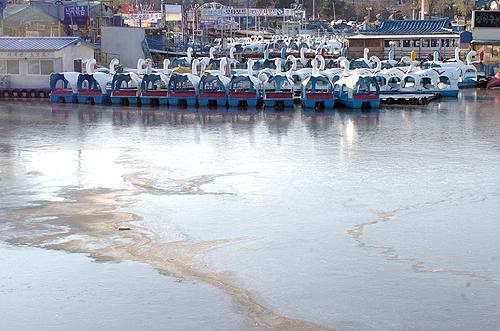 연일 영하 10도가 넘는 한파가 이어지면서 수원시 팔달구 원천저수지도 결빙돼 추위를 실감케 하고 있다. 사진은 13일 원천유원지 보트장에 발이 묶인채 정박해 있는 오리보트.