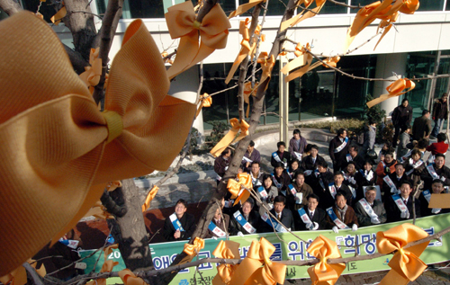20일 오전 수원시청 인근 도로 가로수에 한국장애인고용촉진공단 경기지사 직원들이 장애인 고용촉진을 위한 희망의 리본을 달고 있다.