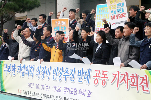◇반발 가열= 민주노동당 도당과 전공노 도지역본부, 수원참여예산연대 등 시민단체들은 31일 기자회견을 갖고 의정비 인상을 강력 반발하고 나섰다.