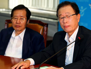 한나라당 박희태 대표와 홍준표 원내대표가 7일 국회에서 열린 한나라당 최고위원회의에서 참석 위원들의 발언을 듣고 있다. /연합뉴스