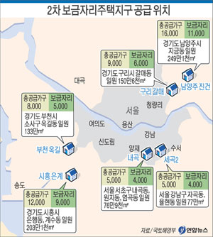 국토해양부는 서울 도심에서 15~21㎞에 입지하고 보존가치가 낮은 개발제한구역 서울 내곡 등 6곳(889만7천㎡)을 선정, 2차 보금자리주택 지구계획을 추진한다고 19일 밝혔다.