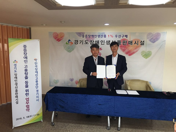 한국장애인고용공단 경기지사는 18일 오전 경기도장애인생산품판매시설 교육장에서 도장애인생산품판매시설과 장애인생산품 우선구매와 중증장애인고용 활성화를 위한 업무협약을 체결했다.