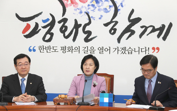 더불어민주당 추미애 대표가 26일 국회에서 열린 최고위원회의에서 김영철 북한 통일전선부장의 방남에 반대하며 장외투쟁을 벌인 자유한국당을 비판하고 있다./연합뉴스
