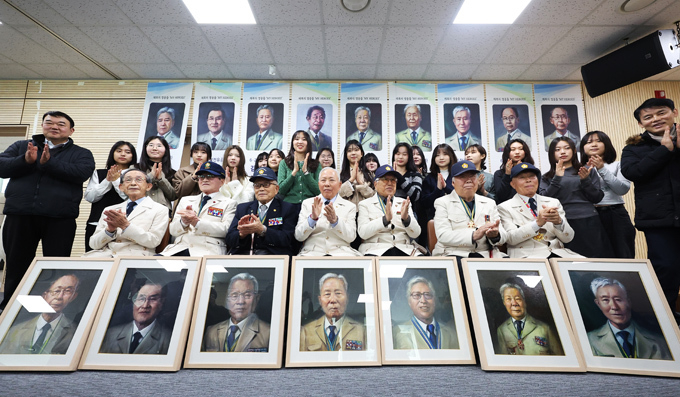 20일 오후 경기도 수원시 장안구 경기남부보훈지청에서 열린 제복의 영웅들 'MY HEROES' 초상화 증정 행사에서 6ㆍ25 참전 유공자들과 초상화를 그린 성신여자대학교 미술대학 서양화과 학생들이 한국성 경기남부보훈지청장 등 참석자들과 기념사진을 찍고 있다.