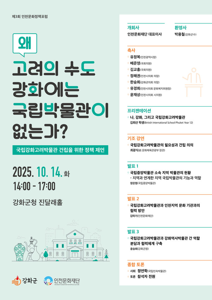 이번 포럼은 강화군과 인천문화재단이 공동으로 주최한다. 39년간 고려의 수도였던 강화에 국립박물관이 없는 현실을 논의의 출발점으로 삼고 있다.