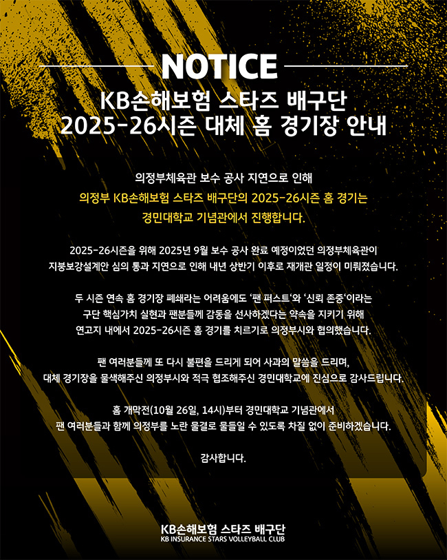 한편 지난 시즌 KB손보는 홈구장인 의정부체육관이 2024년 11월 정밀안전진단 결과에 따라 즉시 사용이 중단된 바 있다. 시즌 중 날벼락을 맞은 KB손보는 대체 홈 경기장으로 경민대학교 기념관을 빌려 남은 시즌을 잘 마무리 할 수 있었다.