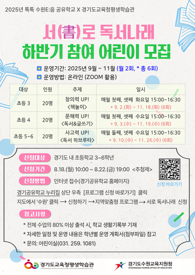 9월부터 11월까지 온라인으로 운영되는 '서(書)로 독서나래'는 다양한 독서 활동으로 독서 흥미를 높이고 또래 친구들과 생각을 공유하며 공감 능력, 비판적 사고력 등을 키울 수 있는 프로그램이다.