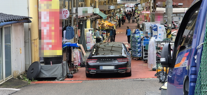 13일 오전 인천 남동구 간석자유시장 진입로의 한 상가. 라면 박스 등 식자재가 담긴 접이식 철제 카트 여러개가 도로 밖으로 나오자 시장에 들어서려는 차들이 멈칫했다. 도로 폭이 크게 줄면서 충돌이 우려돼 정차한 차량들이었다.