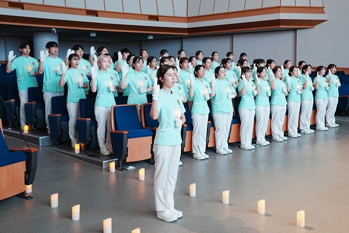 나이팅게일 선서식은 근대 간호의 창시자 플로렌스 나이팅게일의 정신을 기리는 의식으로, 간호학과 학생들이 촛불을 들고 평생을 의롭게 살며 간호 전문직에 헌신할 것을 다짐하는 전통 행사다. 이날 3학년 선배들이 ‘영 나이팅게일’로 참여해 2학년 후배들에게 촛불을 전달하며 간호 정신을 이어받았다.