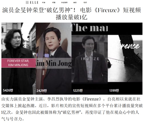 중국 매체들은 김민종의 20년 만의 스크린 복귀작 ‘피렌체’에 대한 현지 팬들의 뜨거운 반응을 전하며, 그의 여전한 인기와 파급력을 집중 조명했다. 특히 릴스 영상 조회수 총합 1억 뷰를 기록한 점을 강조하며, 콘텐츠를 통해 입증된 글로벌 스타로서의 존재감을 높이 평가했다.