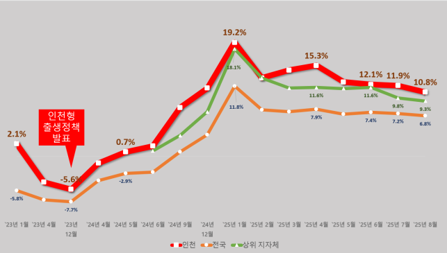 30일 시에 따르면 올해 1~8월 인천 출생아 수는 1만 1008명으로, 지난해 같은 기간(9933명)보다 10.8%를 기록하며 전국에서 가장 높다.