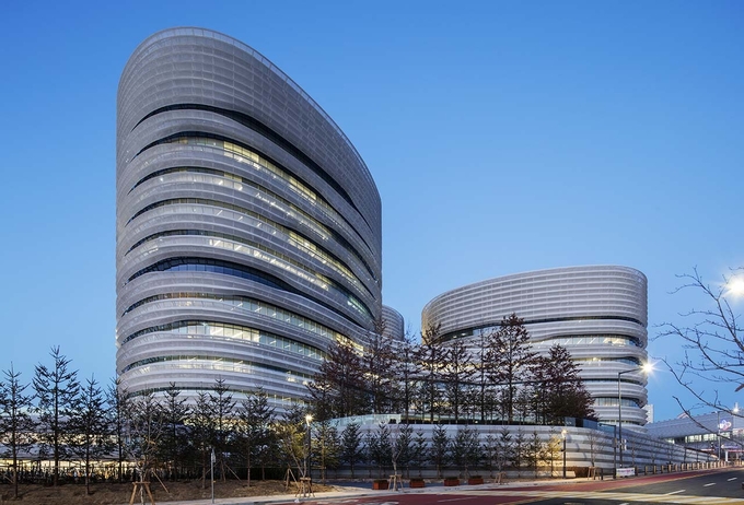물결치듯 독특한 외관을 자랑하는 'CJ블로썸파크'는 2022년 수원디자인대상 수상작이다. 기존 대지의 흐름을 확장하고 개선하고자 건물을 배치하고 언덕의 높낮이와 유선형 보행도로의 흐름을 자연스럽게 어우르면서 기업의 로고를 형상화한 모습이다.