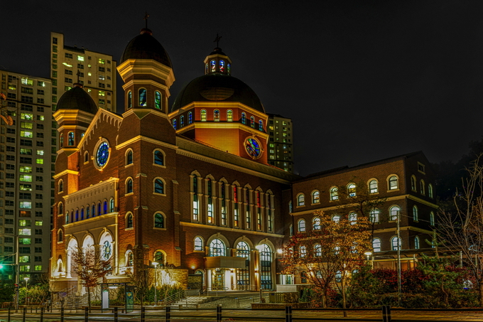 '광교1성당'은 외국 관광지에서 만날 법한 모습으로 아파트 숲 사이를 변주하며 신도의 디자인 격을 한층 높인다. 성당 외관은 서양의 전통적인 건축 요소인 돔과 아치를 현대적으로 간결하게 디자인했다.