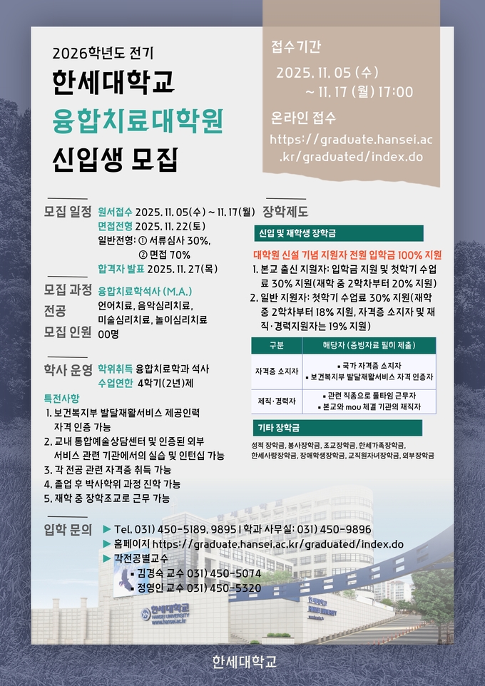 한세대학교는 2026학년도부터 언어치료, 음악심리치료, 미술심리치료, 놀이심리치료 전공으로 구성된 ‘융합치료대학원’ 석사과정을 신설해 신입생을 모집한다고 7일 밝혔다.