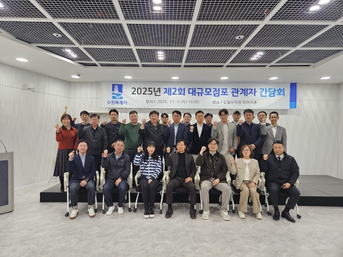 수원특례시가 지역 대규모점포 관계자들과 만나 상생협력 강화를 위한 간담회를 열고, 대형 유통시설과 중소상인이 함께 성장할 수 있는 협력 방안과 새빛세일페스타 공동 참여 방안을 논의했다.